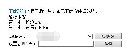 3.下载相应驱动,点击“检测CA”获取CA编号,输入新的pin码,点击“解锁”即可重置完成。